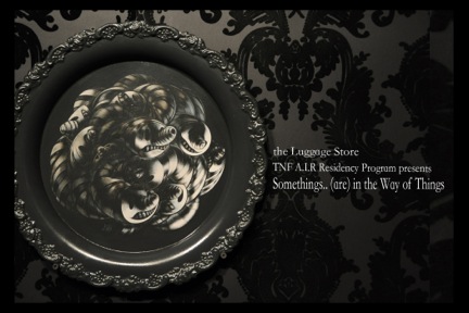 | Christopher Burch’s visual works combine drawing, painting, flocked damask wallpaper, hand painted silver serving trays, and sculpture to create a haughntinlgy surreal full scale site specific installations. The results are conflating landscapes in which historical, socio-economic and political forces that have shaped and continue to shape American racial geographies, teeter on the edge of madness. Something in the Way of Things, written by Amiri Baraka in 2008, is a disturbingly subtle and dark social commentary probing an existential crisis within the African American experience due to the inability to fully synthesize historical and contemporary racial tensions and realties . Memory and testimony (ultimately language itself) become metaphors for seeing or the inability to see. Baraka exposes, that the borders between visibility (to see, to articulate ones experiences) and invisibility (to not see, to not be able to articulate ones experiences) are at times schizophrenic.Burch’s project for the TNF A.I.R residency is entitled “Somethings ..are (In) the Way of Things”. During the months of January 2012 and February 2012 Burch will build a full scale, on site, installatioon/environment re-interpreting Amiris Baraka’s poem “Something in the Way of Things.”Accompanying the installation of work within the Luggage Store Annex, the residency will also incorporate literary performances and dance pieces held in the Tenderloin National Forest itself. These performances and recitals will address various personal interpretations of the poem “Something In the Way of Things.”(Hours: Daily 12-5, closed Mondays)