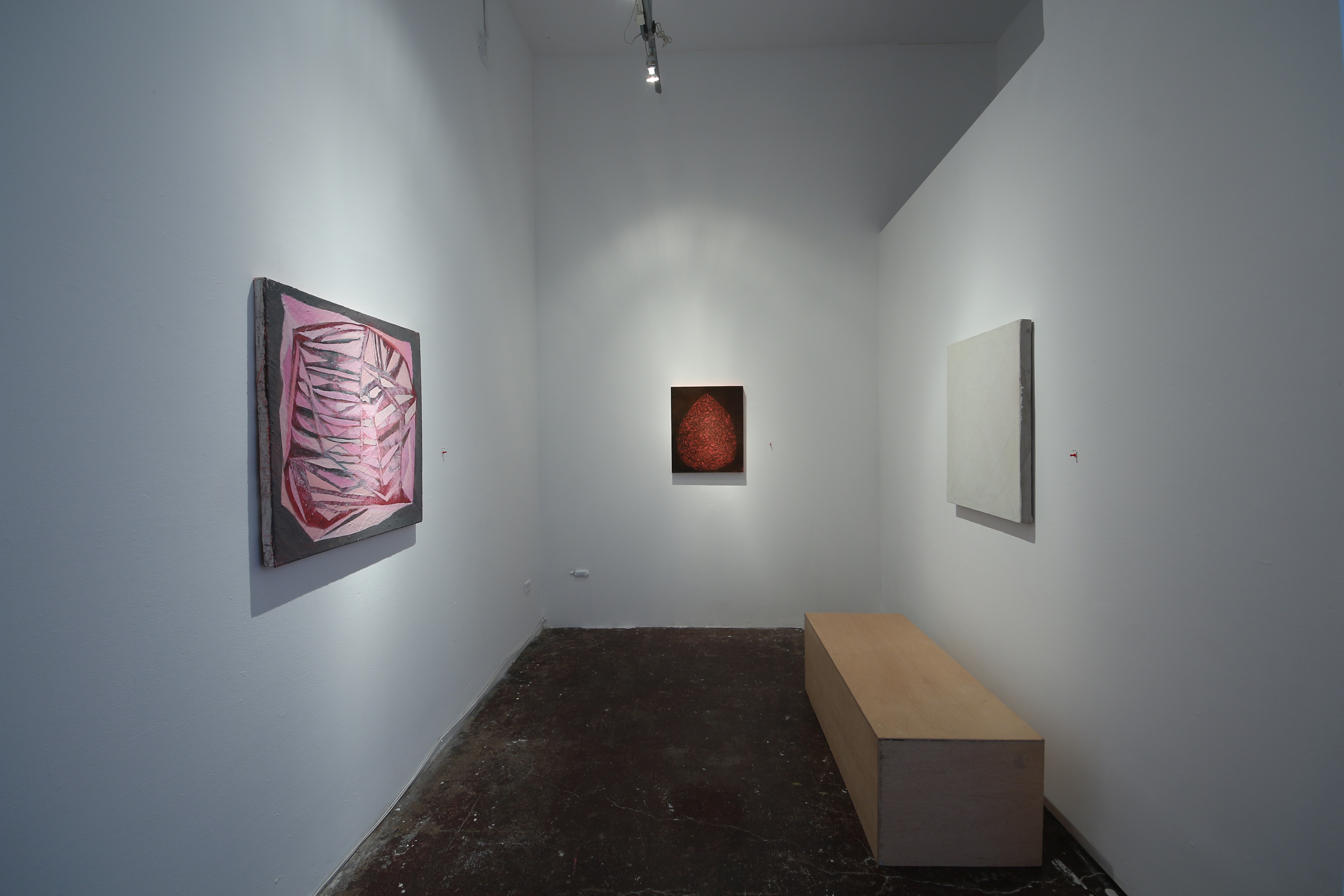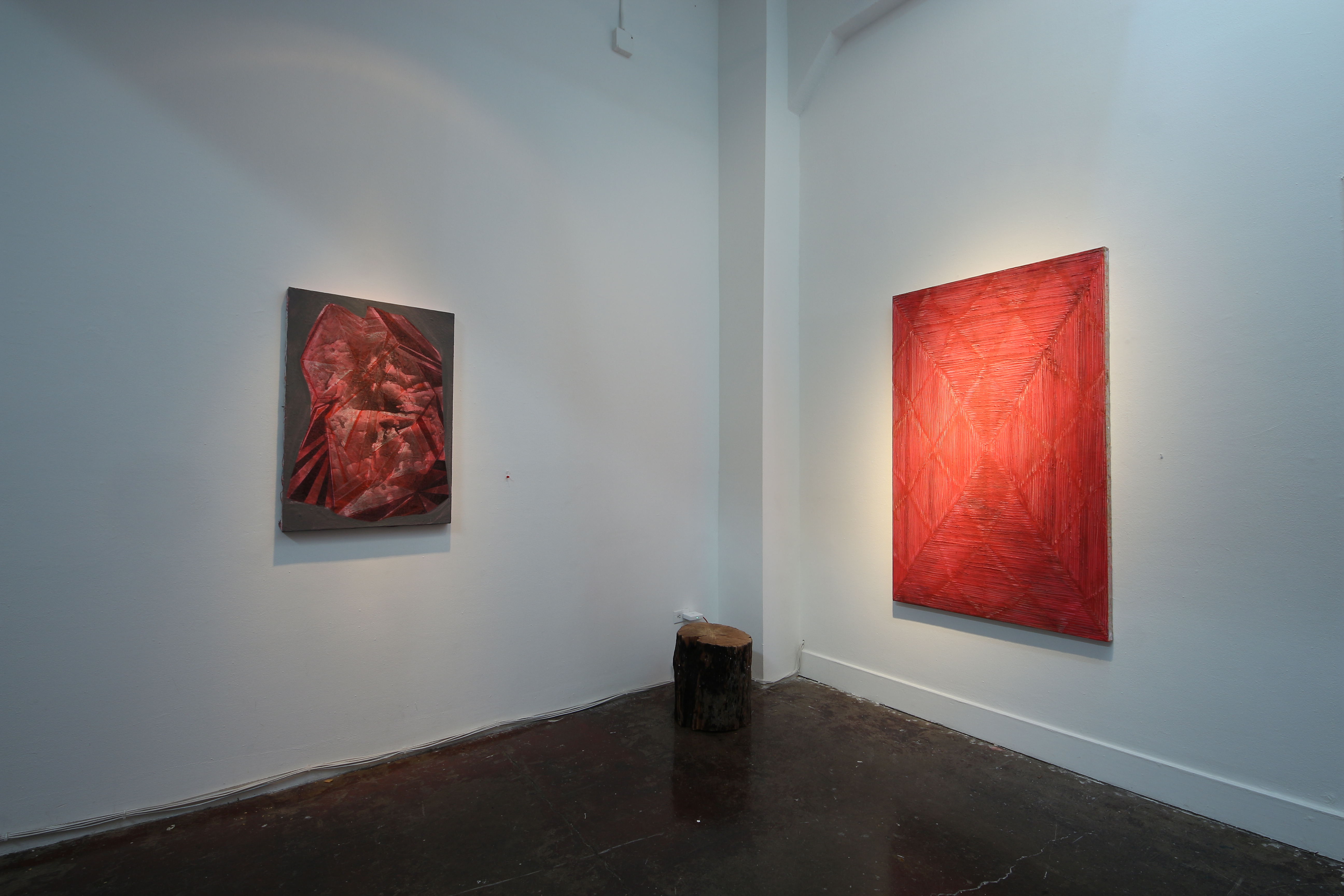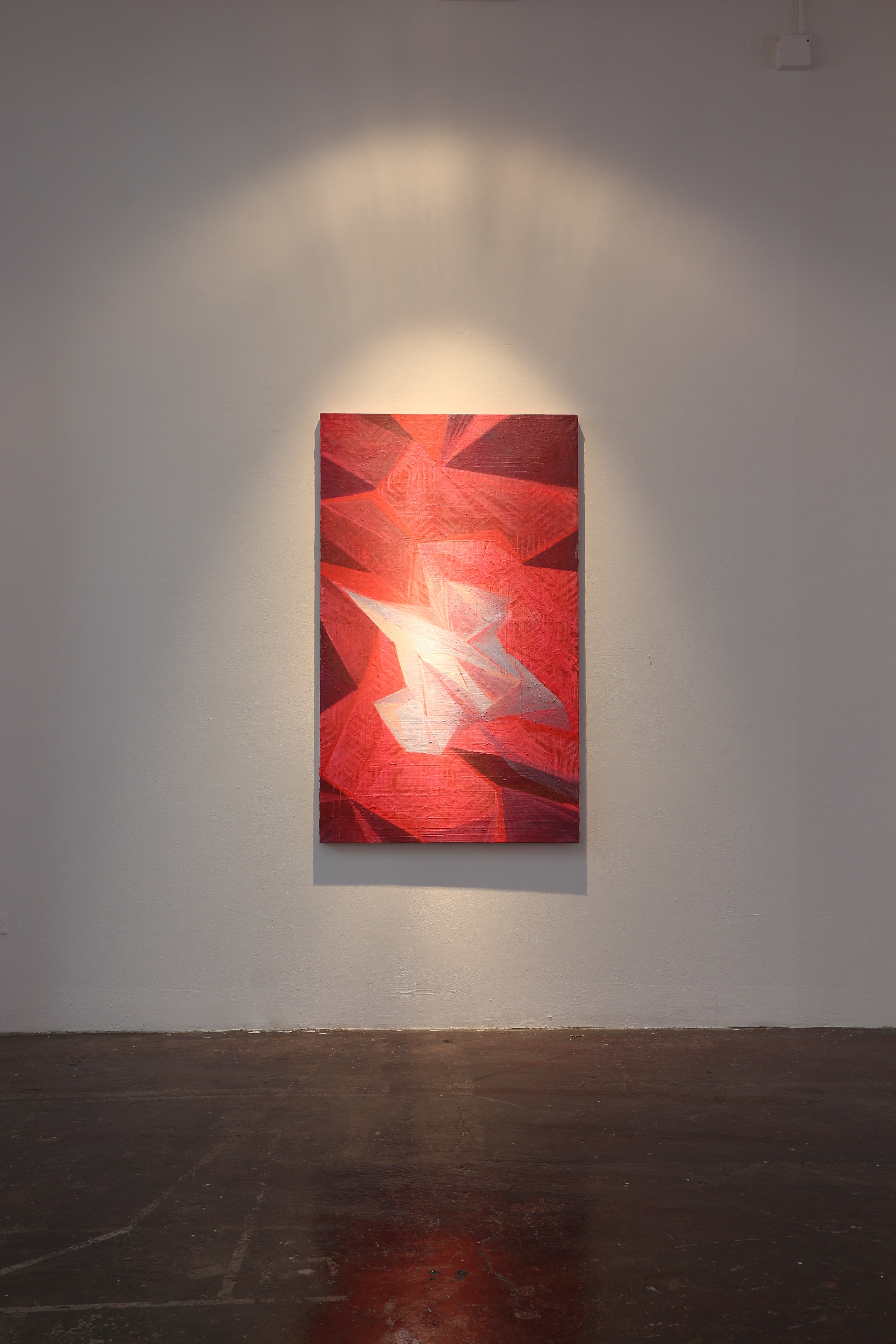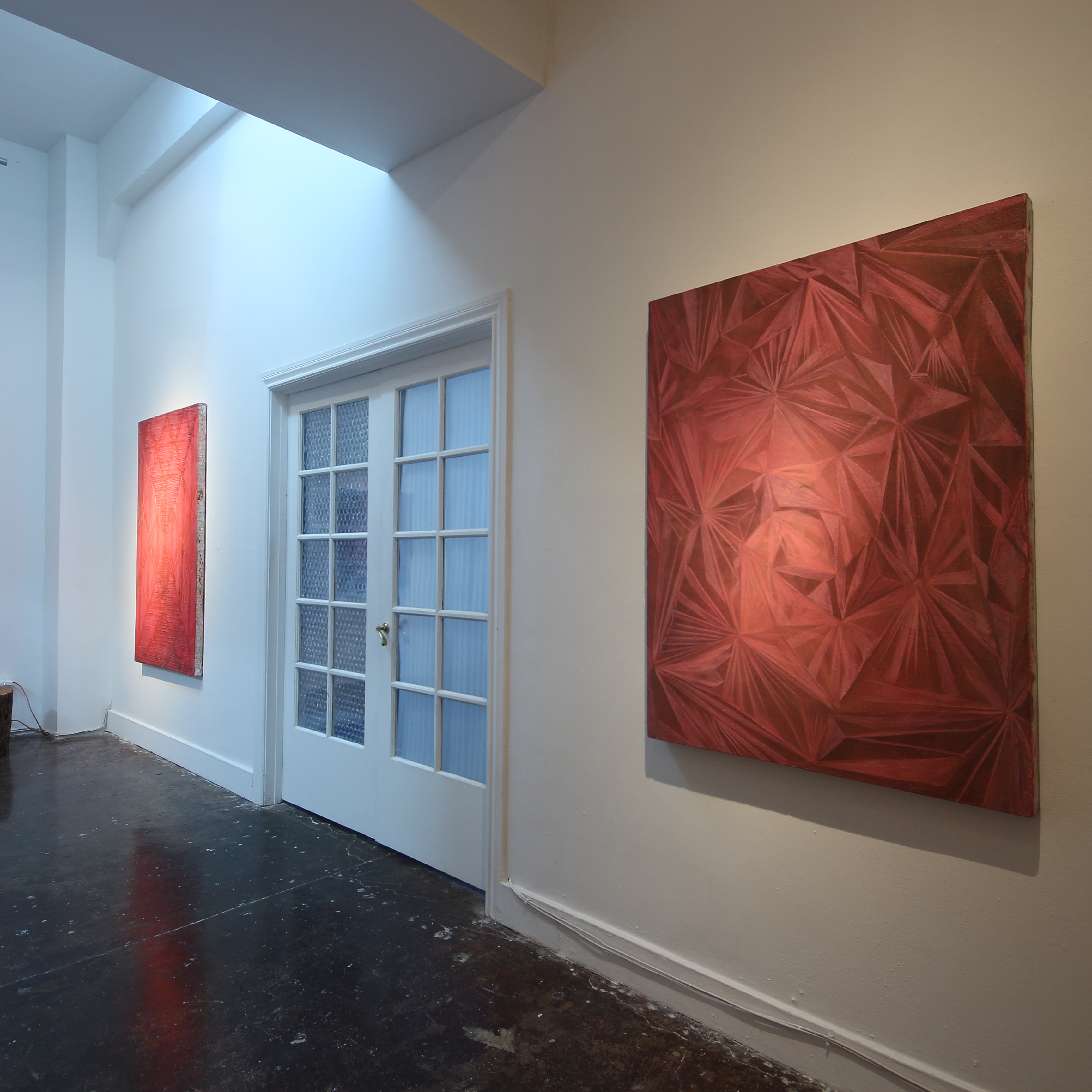 The unfinished paintings each bear deep lines and lightly painted geometric notations, perhaps to light a way back in? At this point they seem to hang somewhere between the discovery of a petroglyph and the beginning of a painting over it. I think that certain sectors of energy rely on artists to unlock and relock them as we see fit. These sectors are alive but in need of discretion, preservation and I would guess ultimately protection. Everything that is going to happen is already happening. So much so that some pieces can only feel finished when several points of entry exist, whichever one is taken the overlaid music of the leading figure feels unlocked and the viewer is then willingly warped….