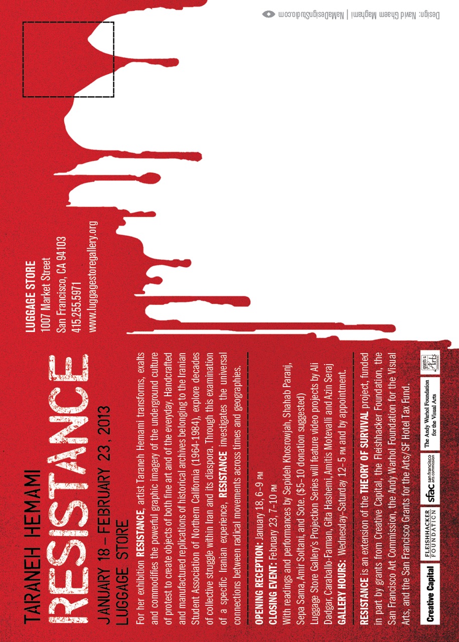 Taraneh Hemami transforms, exalts and commodifies the powerful graphic imagery of the underground culture of protest to create objects of both fine art and of the everyday. Handcrafted and manufactured replications of historical archives belonging to the Iranian Student Association of Northern California (1964-1984), explore decades of collective struggle within Iran and its diaspora. Through this examination of a specific Iranian experience, Resistance investigates the universal connections between radical movements across times and geographies.